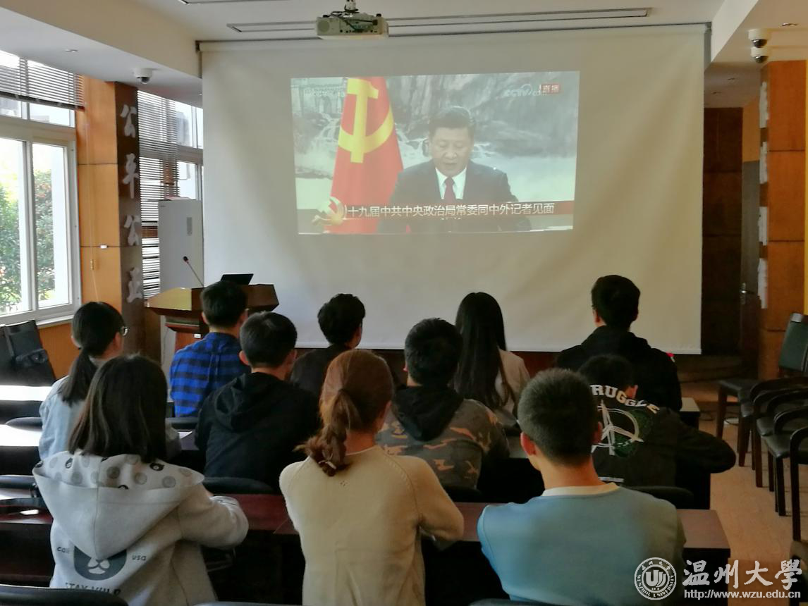 2017年10月25日11时45分,九色视频 法政学院组织法政团学干部集体收看了十九届中央政治局常委见面会的直播节目。各班同学都积极参加并认真收看了本次见面会,共同度过了十分有意义的35分钟。