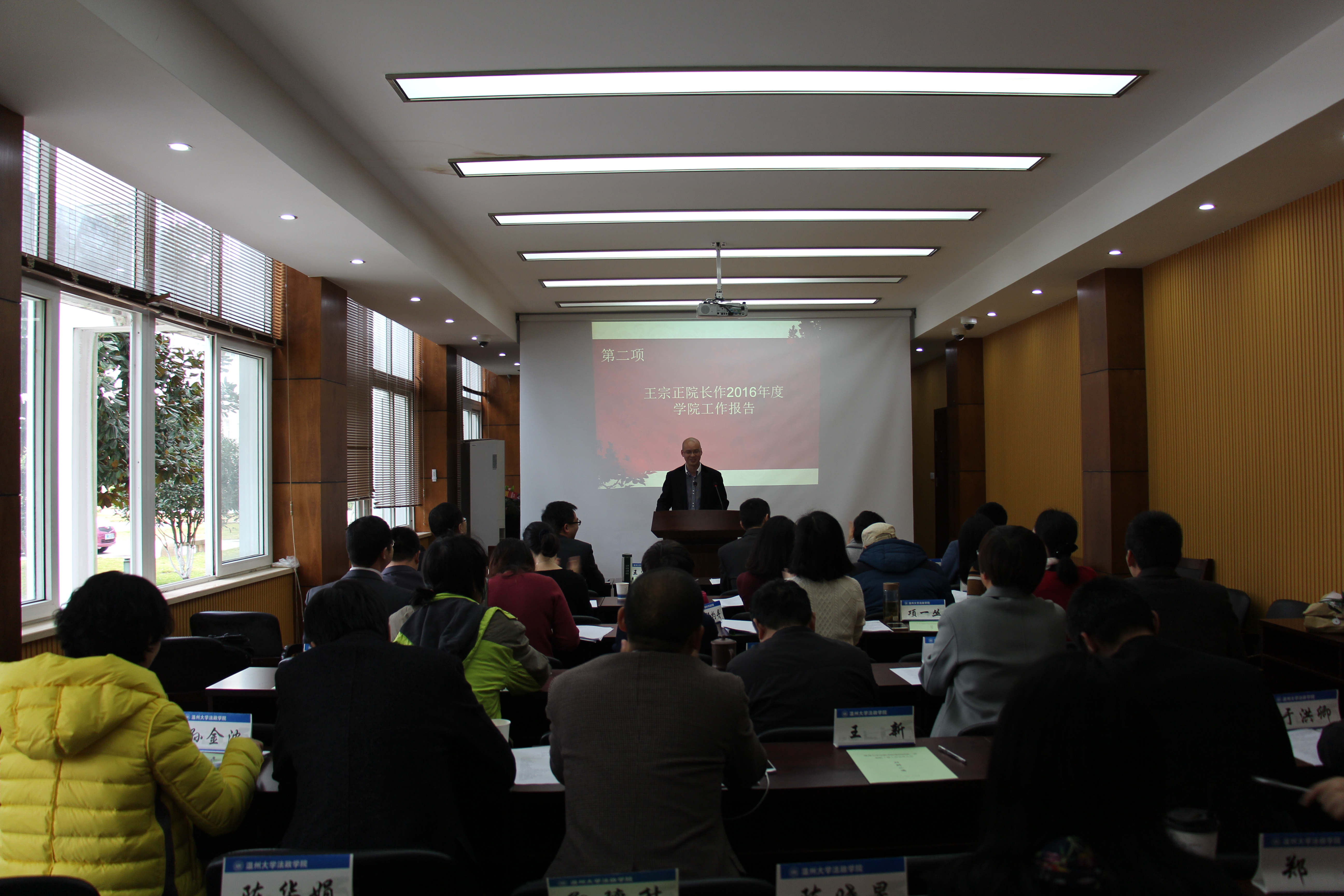 首先,院长王宗正做2016年院长工作报告,报告指出2016年是"十三五"开局之年,在一年里学院各方面取得的一些成绩,其中,获得了省级一流学科立项,学院老师拿到了二项国家社科重点项目,省特色专业中期检查顺利通过,教学考核为A等,同时也要看到一些不足。2017年对学院来说是机遇,也是挑战,全体教师轻装上阵迎接新的挑战。随后,工会主席朱美宁老师作2016年度学院工会工作报告,报告全面回顾了工会为丰富全院教职工文化生活做得一切努力和尝试,并对学院全体老师和领导对工会工作的支持表示衷心的感谢。办公室主任朱美宁老师对学院2016年经费使用做了说明,林钦书记对法政学院"十三五"规划做了说明。三个工会小组展开了激烈讨论,通过了三个工作报告,同时为学院"十三五"规划提出了建设性意见。最后,在热烈气氛中颁发了2016年院长特别奖。