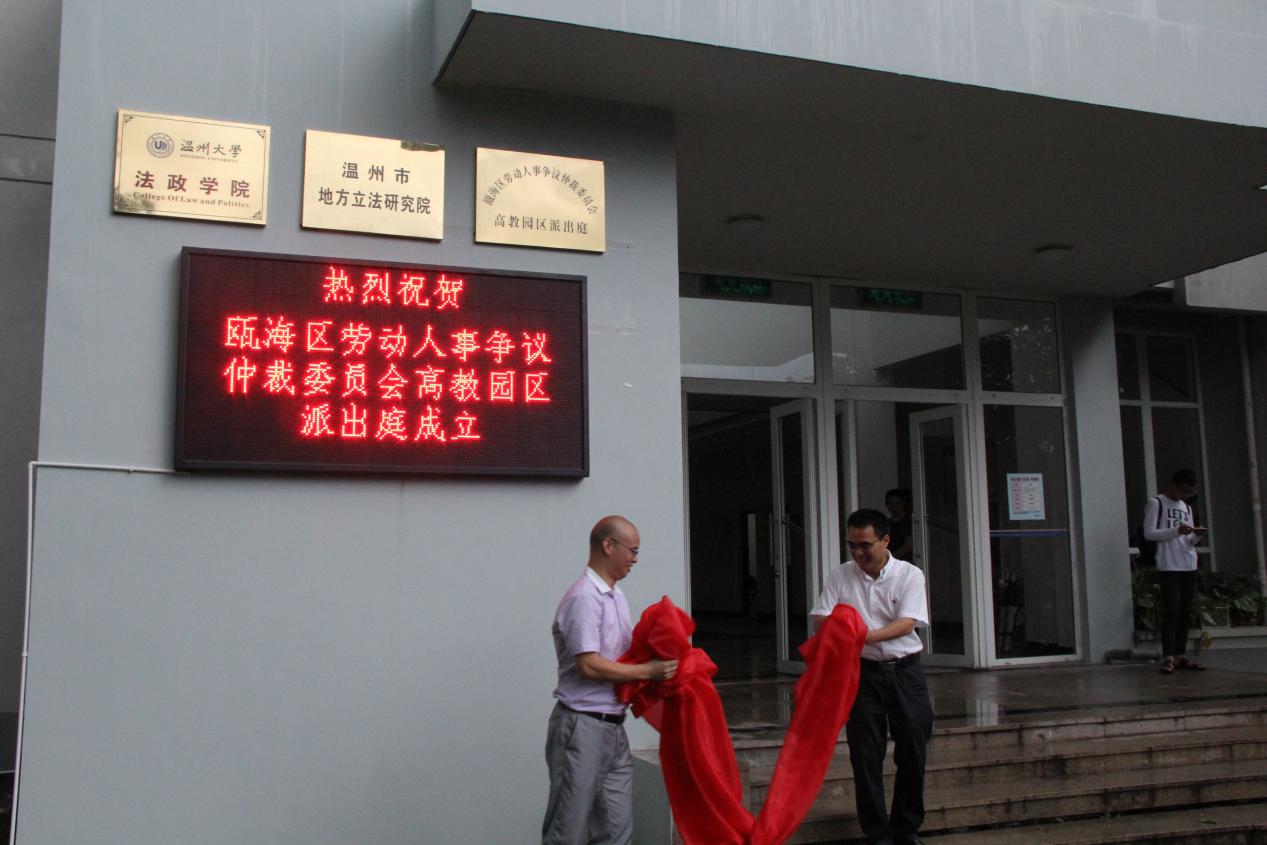 在广大师生热切期待中,在社会各界的广泛关注下,2016年9月28日瓯海区劳动人事争议仲裁委员会高教园区派出庭在我校揭牌成立,并正式运行。