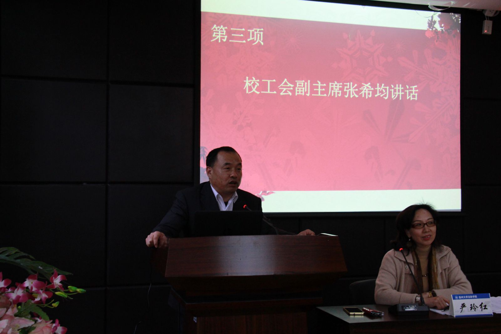2016年1月8日下午两点,法政学院在学院报告厅召开了四届教职工暨工会会员大会,大会由院党总支副书记严玲红主持。学校工会主席张希均全程列席了会议,并作重要讲话。