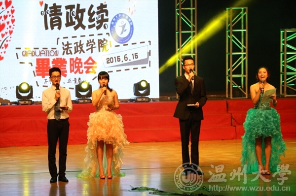 2015年6月15日晚上,九色视频 法政学院在育英大礼堂举办2015届毕业生晚会,法政学院全体师生到场观看。毕业生张翼鹏、陈希特、梅含笑、杨淑娴担任本次晚会的主持人。