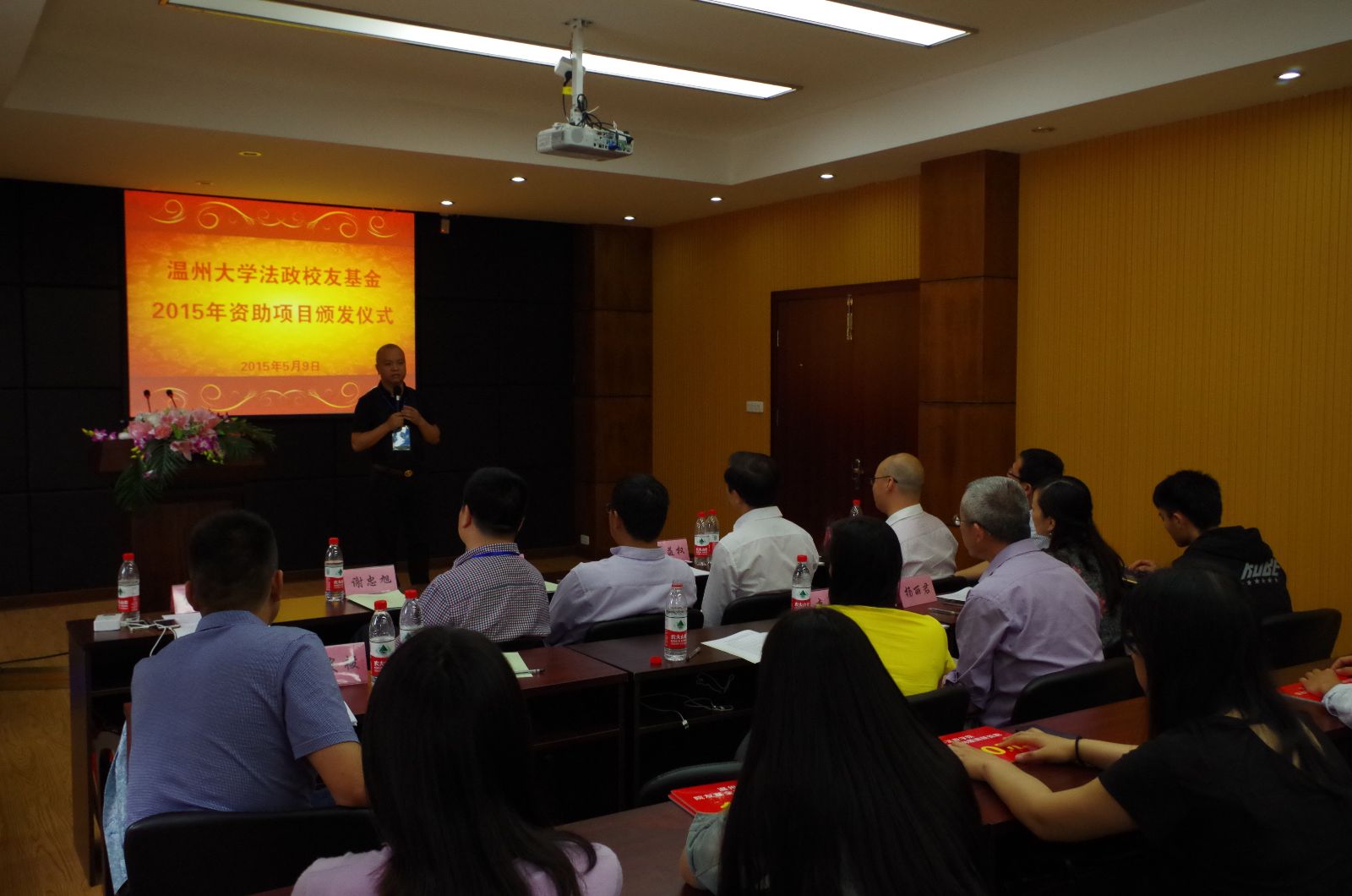 经事先报经法政校友基金理事会陈瑛理事长的同意,会议安排听取了秘书长王柏民所作的基金理事会一年来的工作情况和法政校友基金目前的财务账目状况,审议通过了《法政校友基金资助赴外交换生实施办法》,审核了2015年法政校友基金28项拟资助项目。理事会会议审核通过以上内容后,随即举行了本年度法政校友基金资助项目的颁发仪式。谢忠旭、金忠芳、张炘三位副理事长先后代表基金理事会向获得资助的学生代表颁发资助凭证。金中芳副理事长在颁发仪式上代表基金理事会作了重要讲话。他指出,学习法政的专业知识,最大的优势就是能够较好地适应社会,紧跟形势。他说,无论你做什么,顺应政治潮流和社会发展趋势,都是获得成功非常关键的一个因素。他建议各位学弟学妹要富有创业激情,但是必须要根据自己的实际情况有一个正确的定位和明确的目标,不能盲目地随大流去创业。要做好这些前期的基础工作就需要学习,所以在学校里,还是要强调学习。他最后送学弟学妹们两个字"努力"。他结合自己的创业经历解释说,无论怎么样,你都应该坚持不懈的去努力、努力、再努力,努力做事,努力锻炼,锻炼自己的社交技能,提高自己的情商。