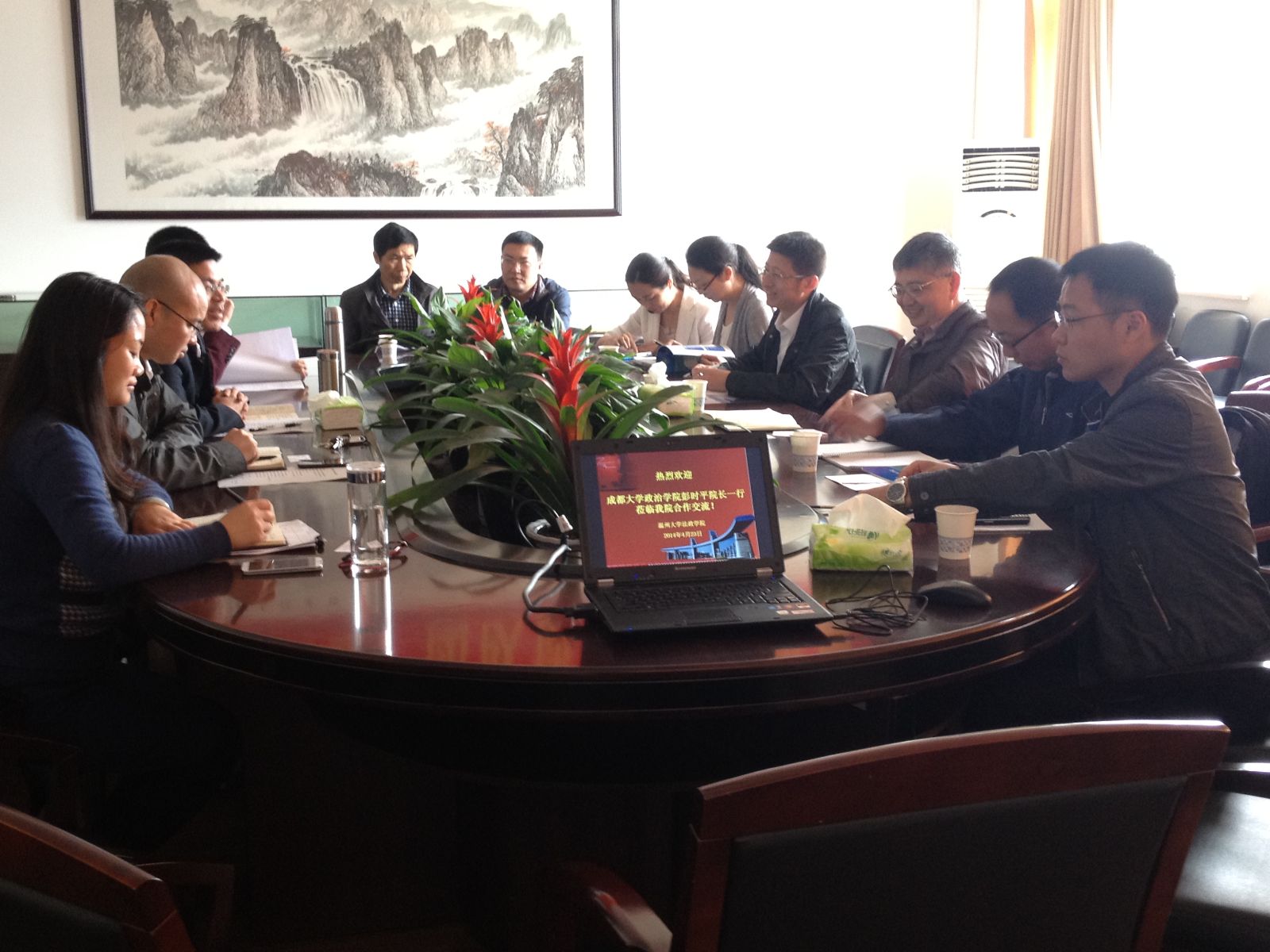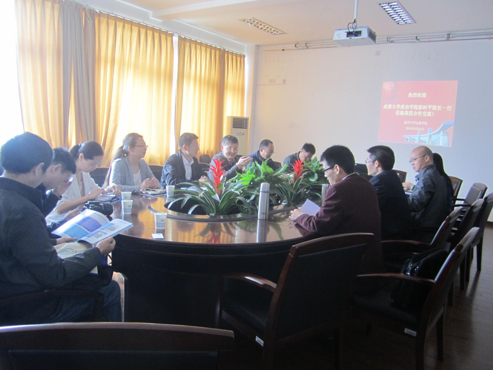钭晓东院长对彭院长一行的到来表示热烈欢迎,他介绍了我校和我院概况及我院专业设置、学科建设情况,希望今后能够与政治学院进一步加强合作。王宗正副院长向来宾介绍了学生培养情况、我院办学特色以及实践教学体系建设等方面的具体举措和未来规划。