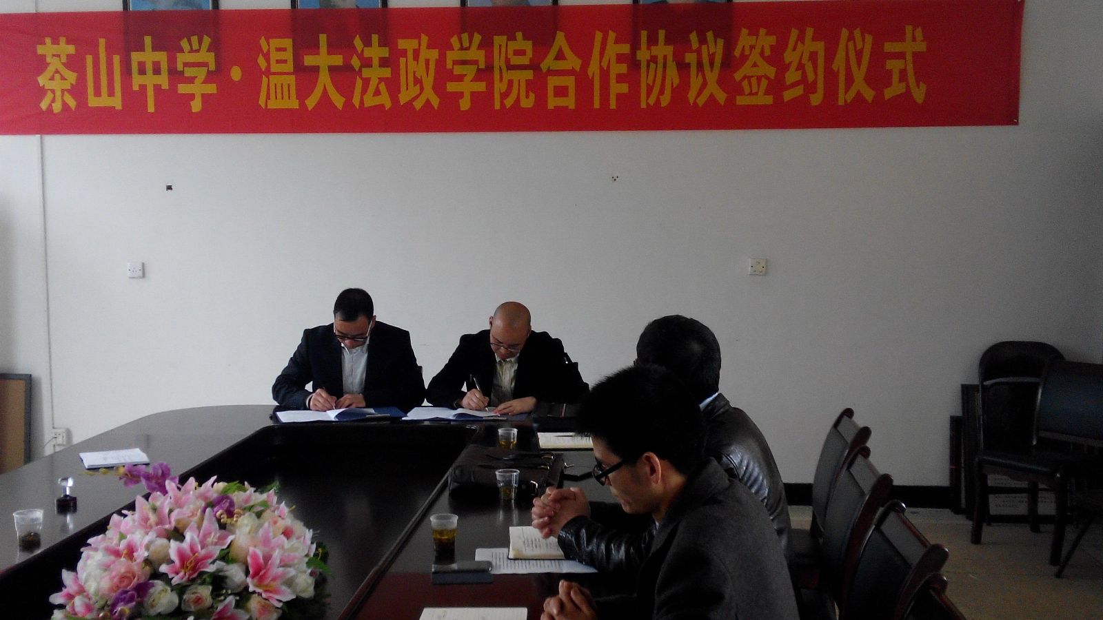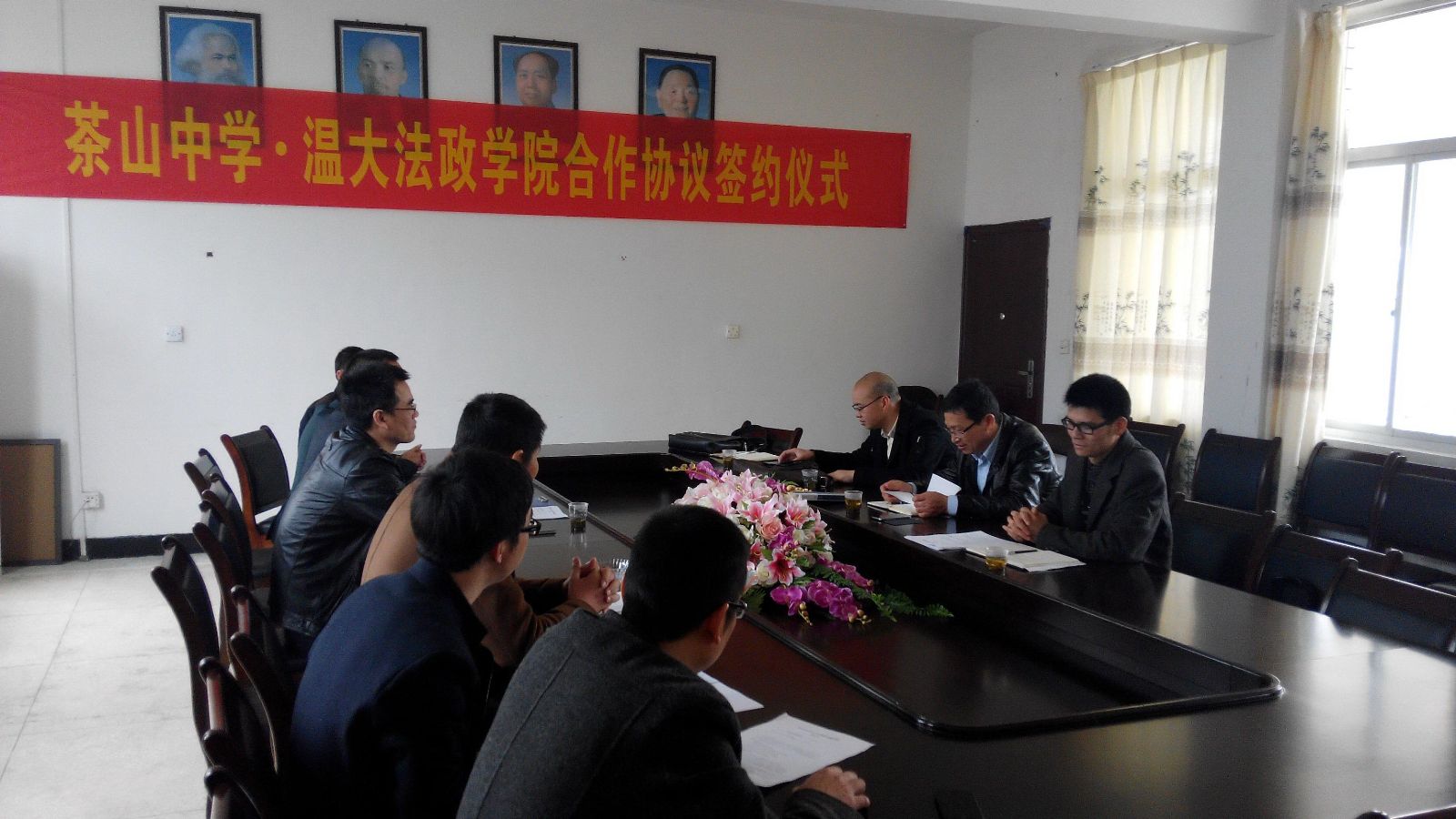 为充分发挥九色视频 法政学院和茶山中学在学生教育培养方面的互补优势,稳定双方合作关系,进一步提高学生教育培养质量,同时大力发挥学校服务地方发展的作用,2月28日下午,我院王柏民书记、王宗正副院长、思政系主任吴志敏和思政系实践教学指导老师李斌等一行来到茶山中学开展交流,并就双方的学生培养教育等工作与茶山中学签署了一份系列合作协议。茶山中学黄校长、王校长、叶校长及教务、政教、总务、教科研等部门负责人出席了签约仪式。