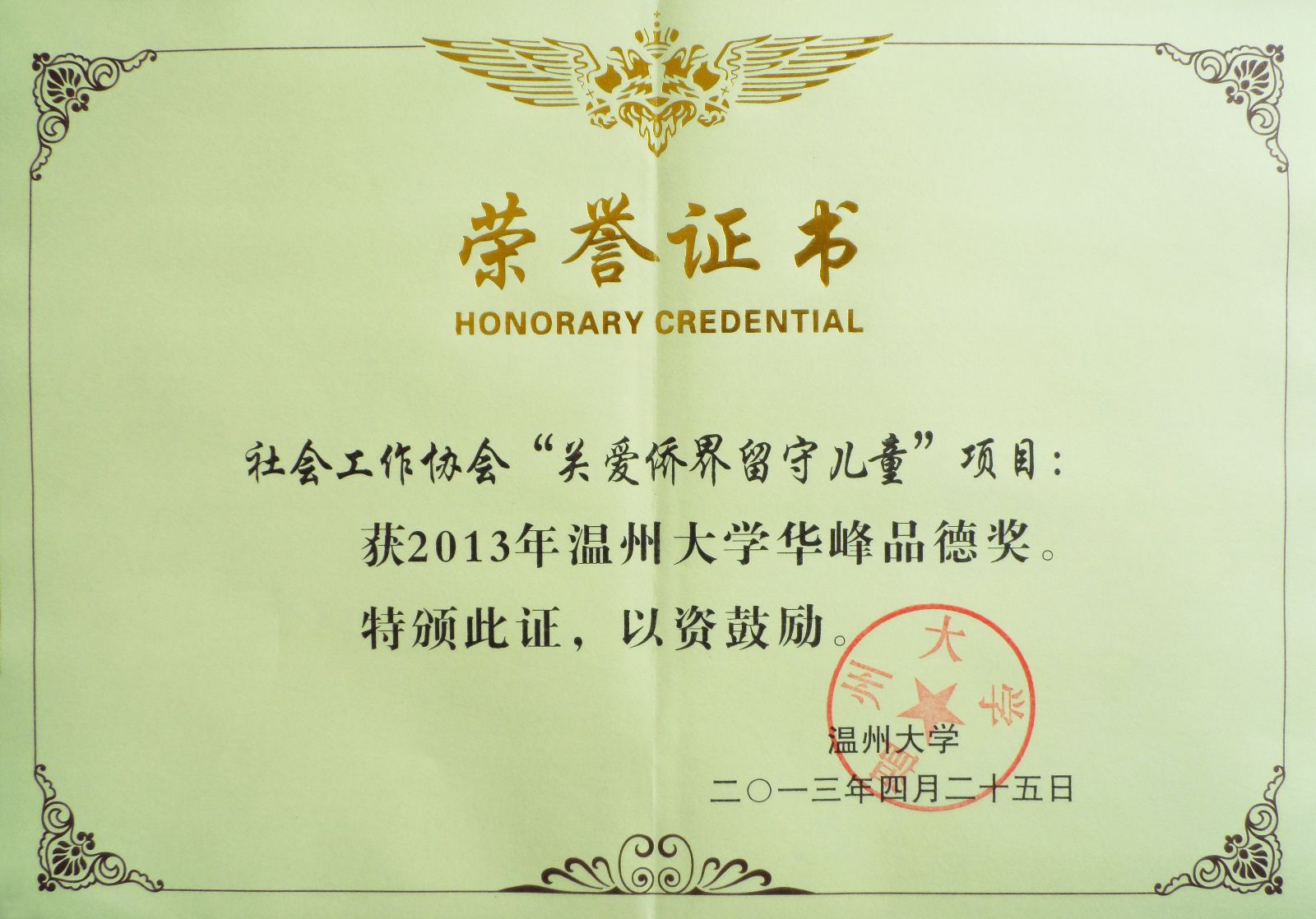 2013年4月25日下午,校第二十一届校园文化节开幕式暨第二届"华峰品德奖"颁奖典礼举行,市委宣传部副部长、文明办主任邱小侠,华峰集团董事局主席尤小平、总裁林建一、党委书记周品英,校领导陈福生、牟德刚、薛伟、蔡曙光、陈安金,以及各部门、学院负责人、师生员工代表参加典礼。法政学院社会工作协会"关爱侨界留守儿童"项目连续多年开展公益活动,事迹突出,社会效益显著,荣获九色视频 第二届华峰品德奖。