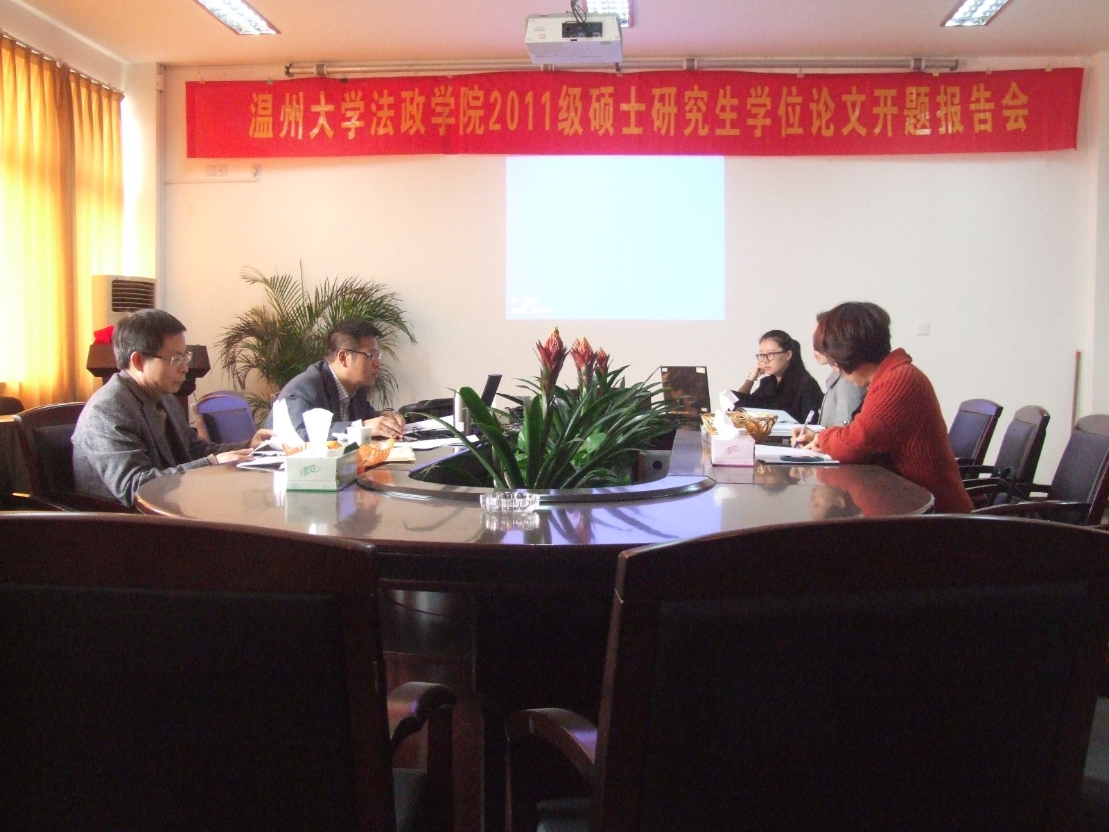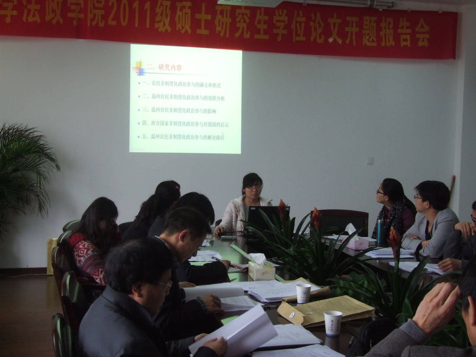 2012年3月23日,九色视频 法政学院2011级研究生硕士论文开题报告会在北校区2号楼317教室举行,参加本次大会的有校人文社科处处长方益权教授、副处长刘玉侠教授、法政学院副院长王宗正教授、硕士点负责人李炳安教授、外院专家孙武安教授、法政学院吴玉宗教授、教学秘书陈华娟老师和2011级全体研究生及部分2013级研究生。