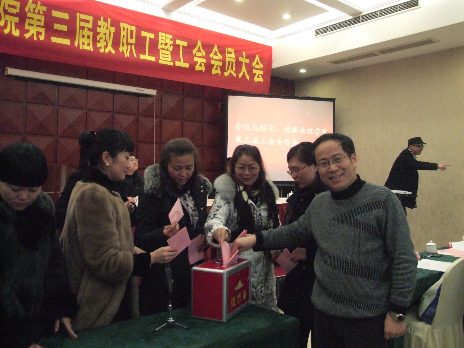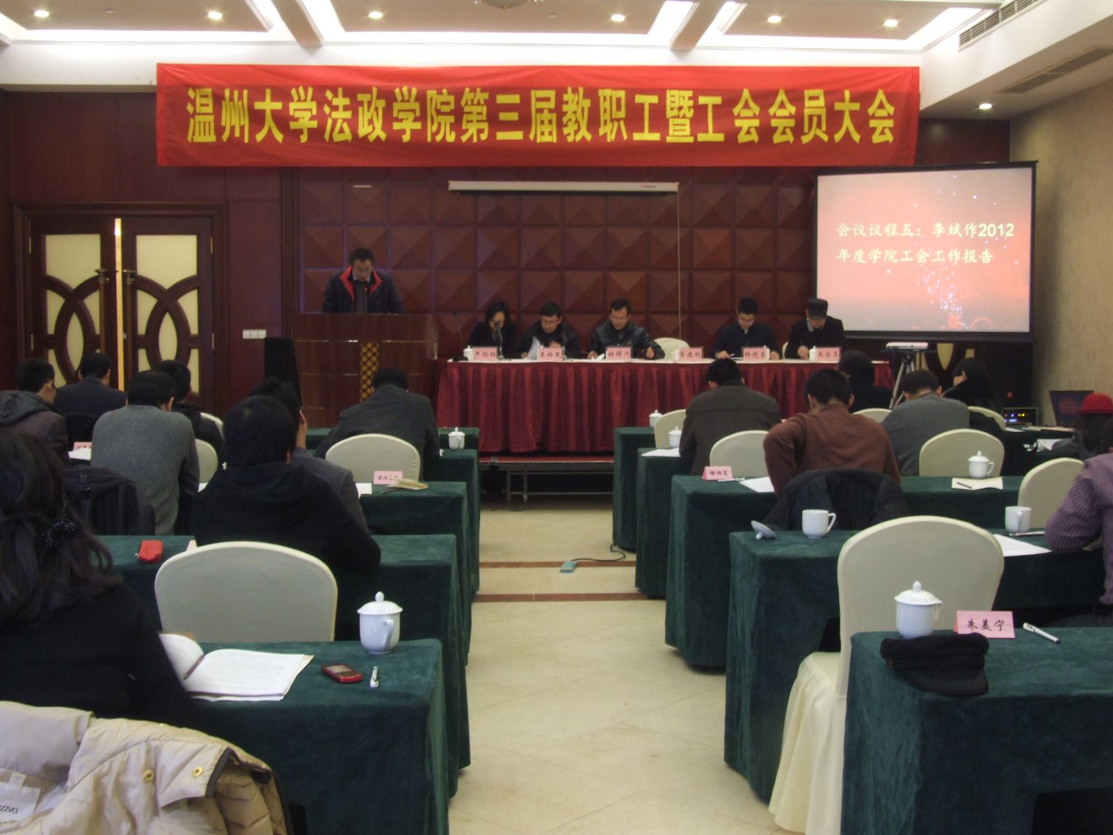 工会副主席李斌作2012年度学院工会工作报告。报告全面回顾了学院工会过去一年的工作。李斌指出:一年来学院工会日常工作严格按工会制度开展,特殊事务或重大事项坚持民主决策;关心教职工生活,热心为教职工谋福利;积极组织开展各类文体活动,促进教职工身心健康;鼓励老师不断提升业务水平,关心学生成长,塑造优良师风;合理统筹安排,管好用好工会经费。接着,李老师对2013年工会工作提出设想。他指出:新的一年,工会将围绕法政学院"凝心聚力,互哺共生,团队协同,持续发展"的学院精神以及学院和谐文化建设的中心,积极倡导"健康工作到退休"的工作理念,推动广大老师更加合理地协调工作与生活的关系,提高工作效率,提升幸福指数。工会将广泛听取老师的意见和建议,从细微处入手,踏踏实实,努力使工作更上一个新台阶:以食品安全为切入口,继续关注老师身体健康状况,使更多老师热爱体育活动;从细微处入手,积极主动、不断创新,提高工会工作质量。