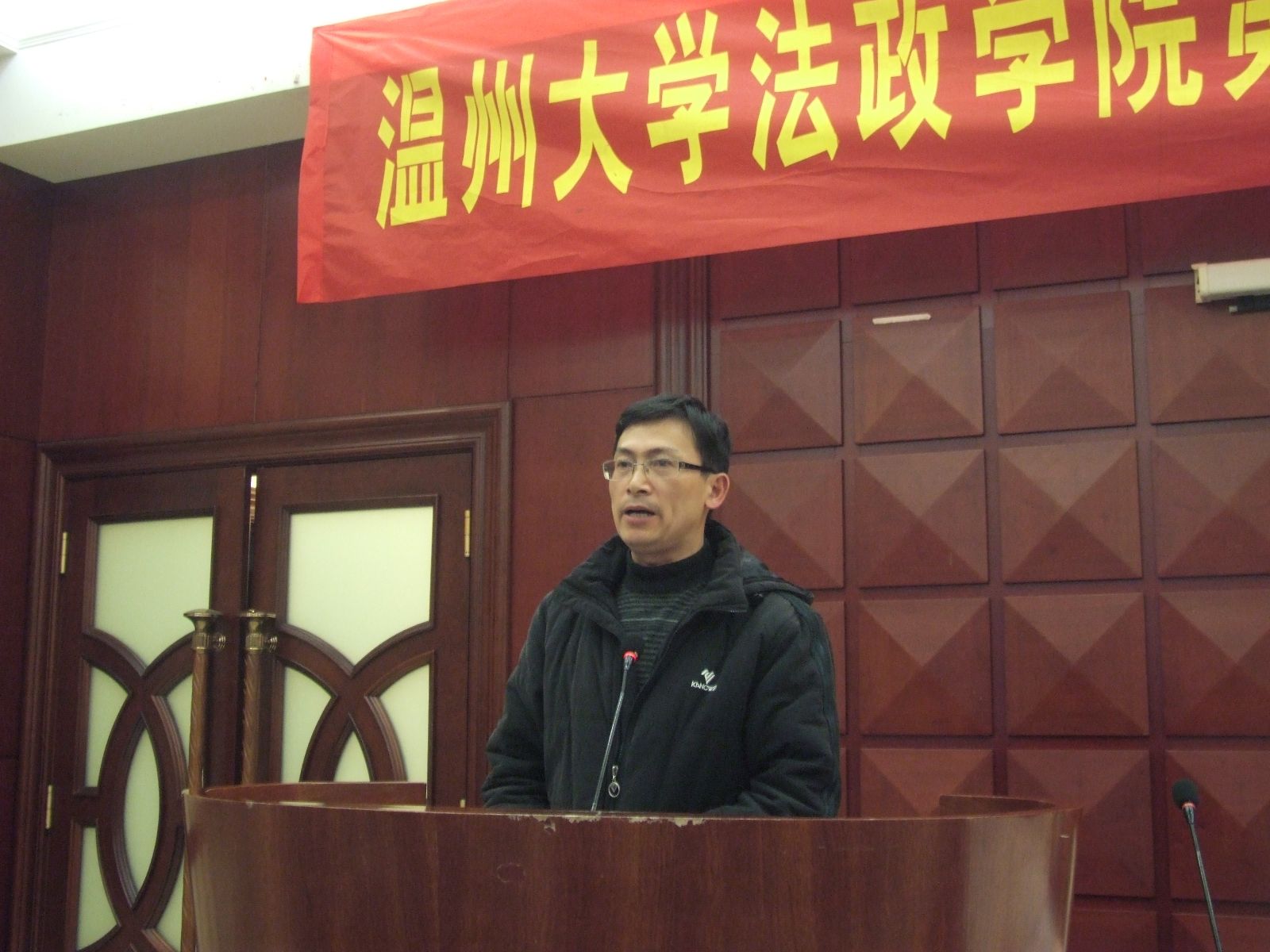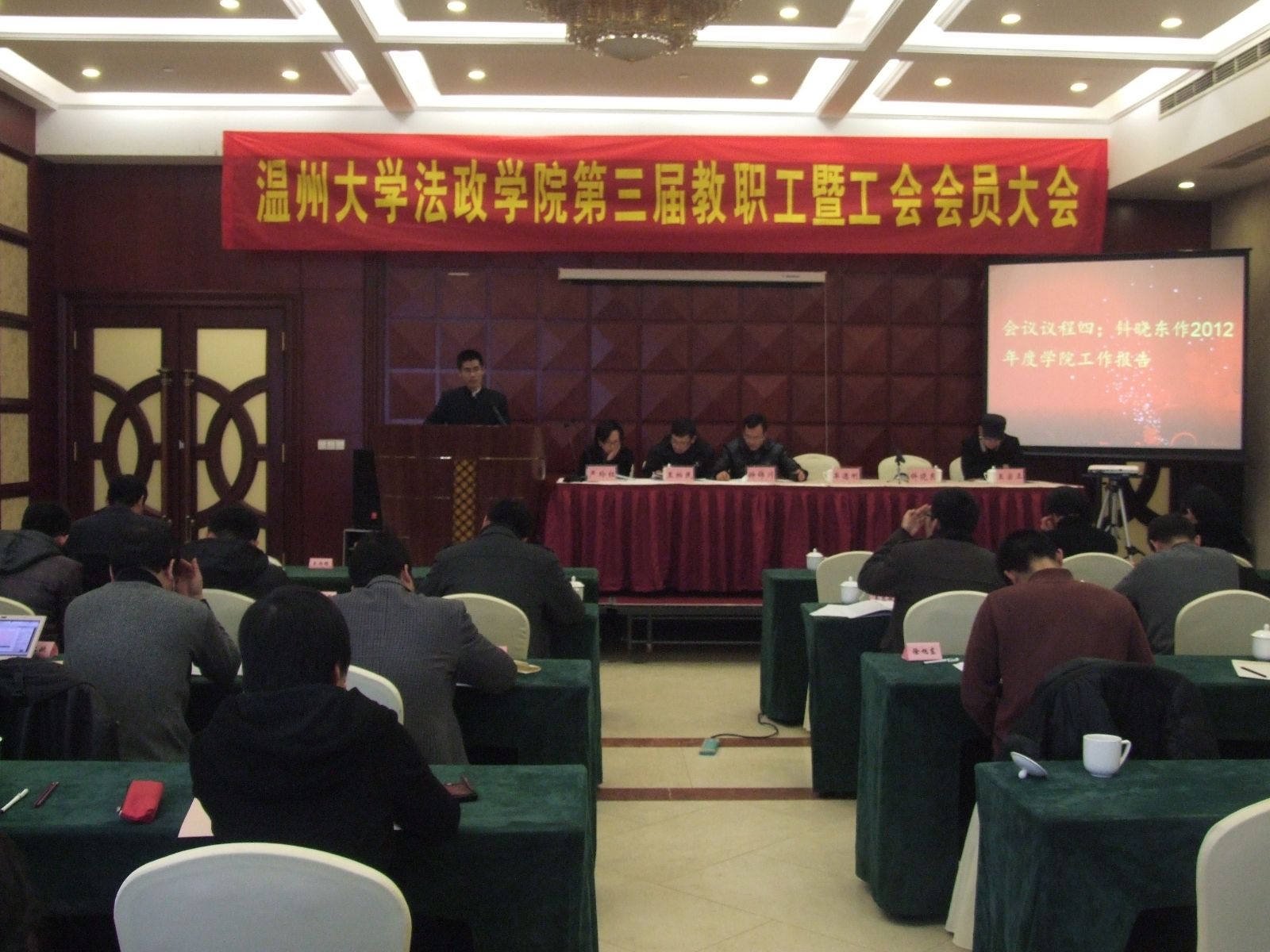 钭晓东院长作题为《凝心聚力 互哺共生 团队协同 共创持续发展的法政学院》的工作报告。钭院长指出,一年来,在校党委的正确领导下,法政学院党总支和行政班子紧密围绕学校中心任务,工作定位准确、工作思路清晰,全院上下精诚团结、凝心聚力、开拓创新、务实进取,以高度的责任感和强烈的事业心推进各项工作。学院内涵建设逐步深入,对外联系显著加强,发展环境不断改善,发展后劲不断显现。学院在人才培养、教育教学改革、学科建设、师资队伍建设、学生工作、党建工作等方面取得了一系列新成绩、新突破。学院的教育教学改革成果丰硕,人才培养质量进一步提升; 成果获奖、科研立项与经费稳步增长; 学科发展平台呈多元化拓展; 内生外引,师资团队实现培育与厚实;创新育人工作模式,学生思想政治工作成效显著; 扎实落实"基层组织建设年"工作,党建工作稳步推进;积极筹备"校庆工作",整合发展资源、开拓学院发展平台;高度重视宣传文化与工会建设,功能得到有效发挥。