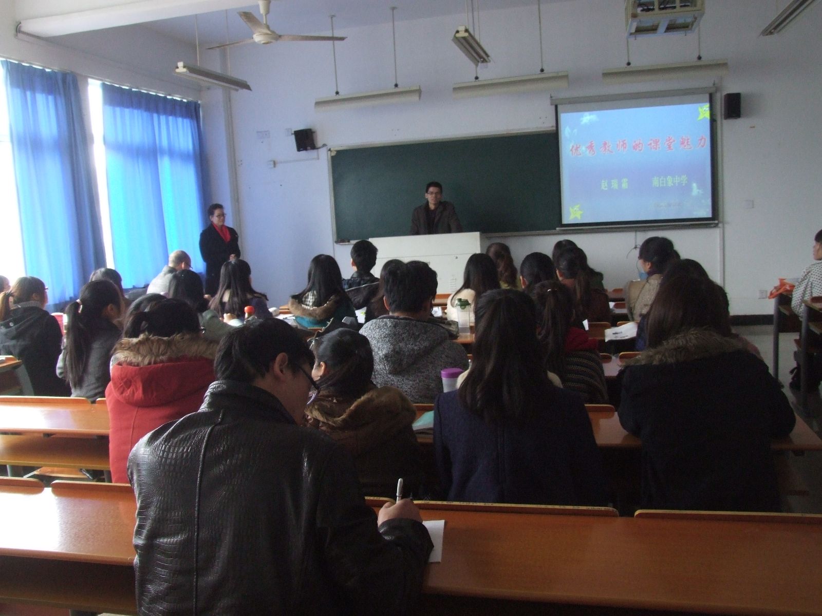 为了更好提升师范技能、了解中学一线的课堂现状,12月14日上午,法政学院邀请了南白象中学校长赵瑞霜来为思政专业学生作关于"优秀教师的课堂魅力"的讲座。聆听本次讲座的有学院书记王柏民,副院长王宗正、以及专业教师李斌、孙金波等,讲座由思政系主任吴志敏主持。