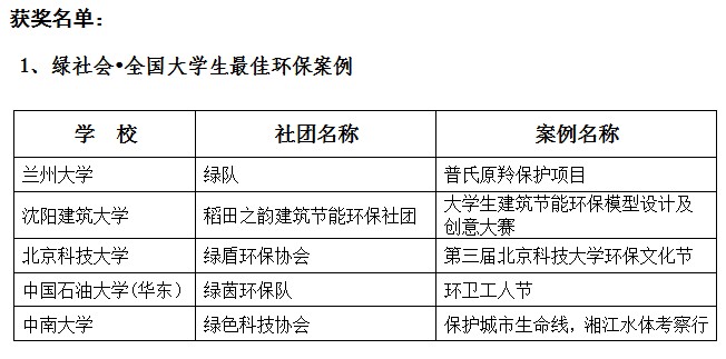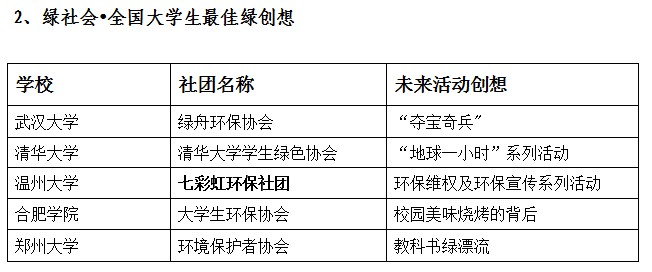 在活动中,我院七彩虹环保社团(七彩虹环保法治联盟)荣获"绿社会•全国大学生最佳绿创想"奖。此次在全国各高校环保社团提交的方案中共评出5个"绿社会•全国大学生最佳环保案例"奖和5个"绿社会•全国大学生最佳绿创想",获奖名单如下: