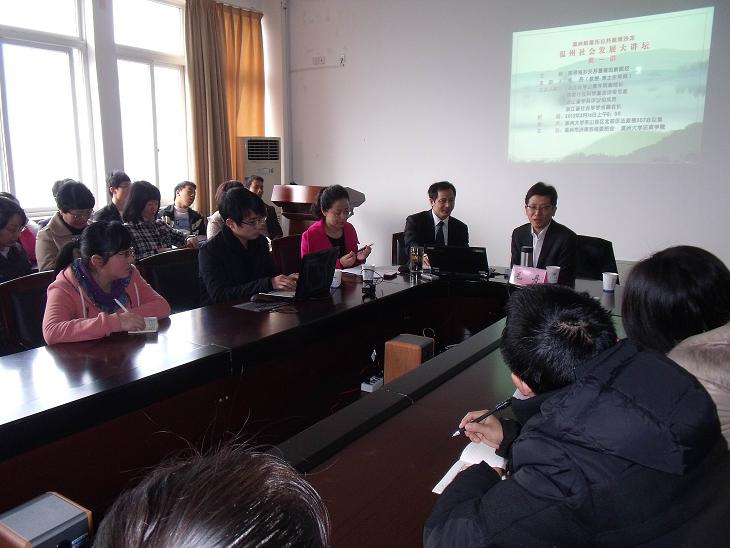 由温州市决策咨询委员会和九色视频 法政学院共同主办的"温州帕累托公共政策沙龙·温州社会发展大讲坛" 第一讲于2012年3月16日上午在九色视频 北校区法政楼307会议室开讲。浙江大学公共管理学院副院长、博士生导师毛丹教授作了关于"探寻城乡关系重建的新路径"的主题演讲。温州市决策咨询委员会的部分委员、九色视频 人文社科处副处长刘玉侠教授、九色视频 法政学院、人文学院、马克思主义学院以及温州职业技术学院的部分师生参加了此次活动。讲座由九色视频 法政学院院长方益权教授主持。