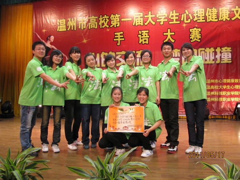 在刚刚结束的温州高校大学生"心的交流·梦的碰撞"首届手语大赛中,由我院洪素梅(10行管)、唐晓芳(10行管)、陈星月(10行管)、李弯弯(10行管)、陈影(10行管)、黄金凤(10行管)、姜昆(10行管)、徐世波(10行管)、包慧敏(10政本)、张少男(10法二)、郑晓敏(10法二)等同学组成的法政学院《怒放的生命》手语代表队在学院和校心理健康教育中心的支持和指导下表现出众,获评大赛最具潜力奖。