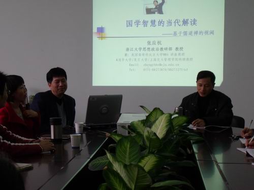 张应杭教授不仅是深受浙大学生追捧的国学大师,同时还兼任美国南哥伦比亚大学MBA课程讲座教授、澳门科技大学管理学院MBA兼职导师等多职,也被国内多家媒体邀请进行国学智慧系列的讲座。今天的讲座以现代人生理论中的"术""道"之辩开始,如果说西方人生理论以"术"见长的话,那么中国传统的人生智慧则以"道"为尊,张应杭教授指出"明道"是中国传统人生智慧的精髓,接着他以儒家德性立身的安身之道、道家道法自然的处世之道、佛家空观大于世界的觉悟之道来分别阐读儒、道、佛三家的不同"道"解。张应杭教授以其深厚的国学理论、丰富的人生阅历、精彩的见闻轶事、诙谐的流行语言深入浅出,通俗易懂地为在场师生诠释了经典国学中的人生智慧,会场不时响起阵阵掌声。在学术沙龙的互动环节,在场教师和研究生分别就国学的概念界定、对国学典据的理解以及人生价值观等疑问与张教授交流意看法,张应杭教授均一一给予详实的解答。最后张教授希望同学们能够从以儒、道、佛为代表的中国古代文化中汲取丰富的安身道和处世智慧。当在场师生还陶醉于张教授的精彩讲演和焦灼互动之时,方益权院长因时间原因不得不结束本次学术沙龙,他高度赞扬了张应杭教授的讲学,并对作为自己老师的张教授表示了深深的敬意和感谢,同时也表达了我院师生对张应杭教授再次讲学的热烈期待。