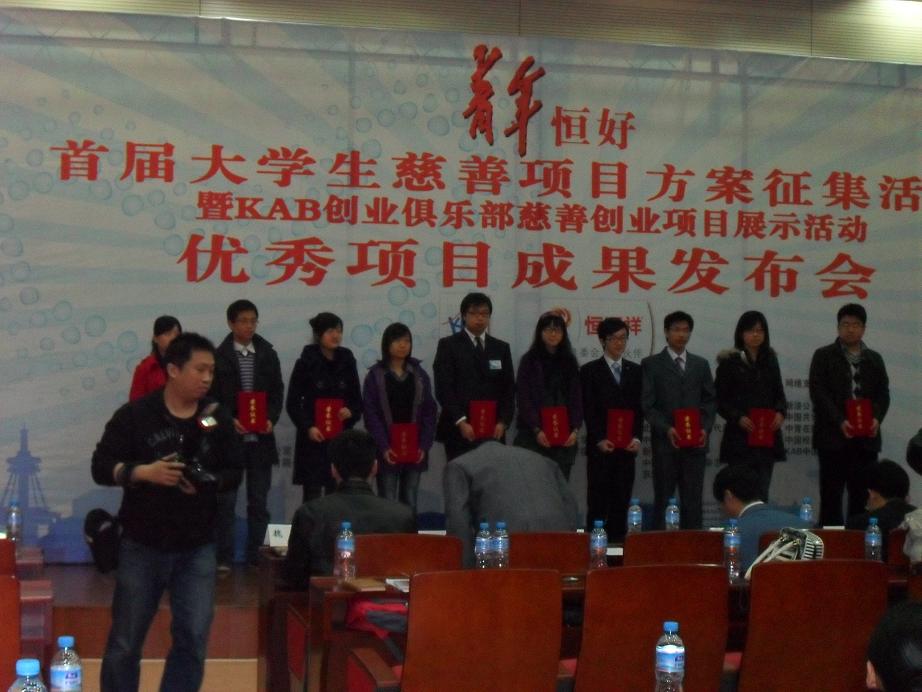 2010年4月19日,全国首届大学生慈善创业项目方案设计大赛成果发布会在中央财经大学举行。此次活动是在共青团中央、全国青联、国际劳工组织的指导下,由KAB全国推广办公室、恒源祥(集团)有限公司等单位共同发起的,旨在推动各高校开展KAB创业教育课外实践活动,培养大学生具备包含社会责任在内的优秀的创业观念和技能,将社会责任的基因植入中国未来的创业者群体中。