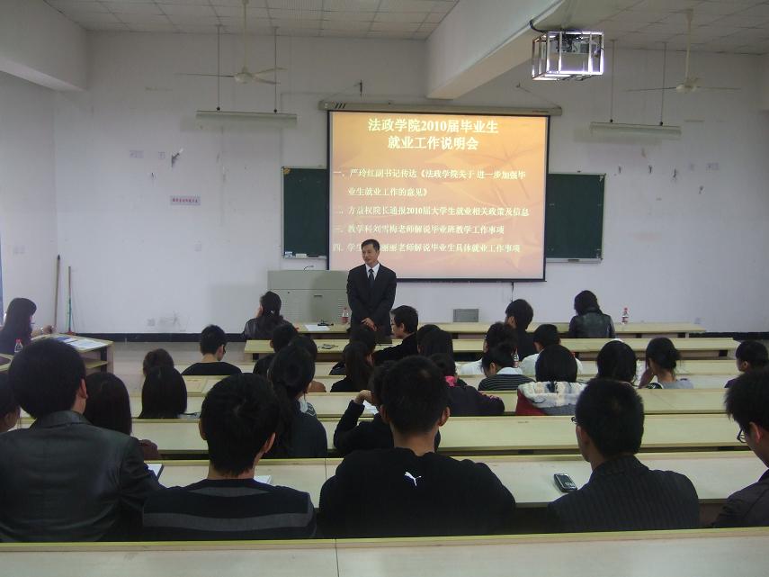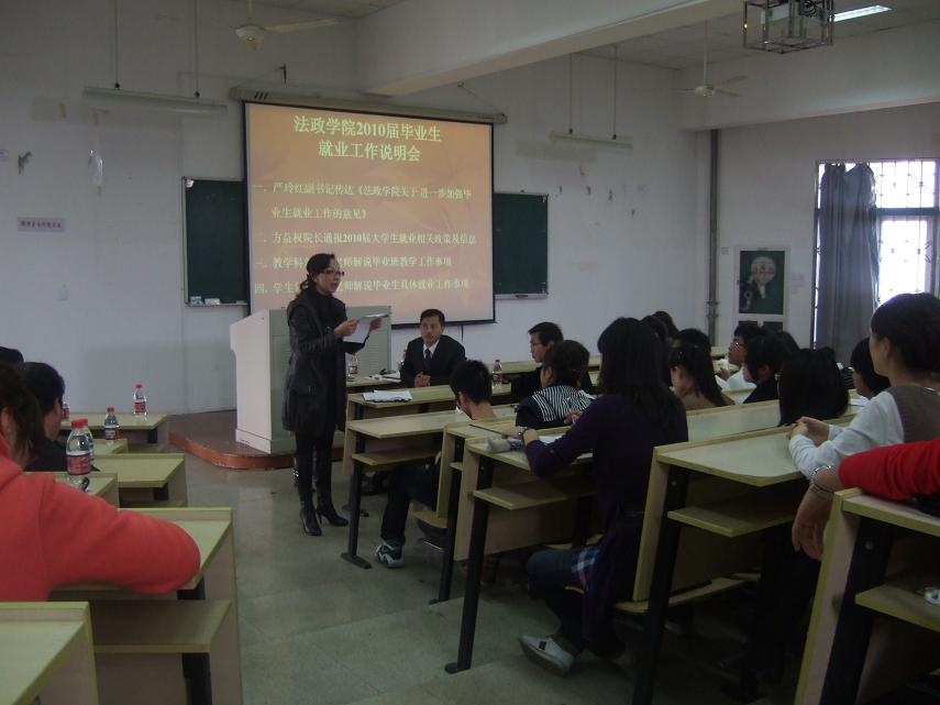 为了进一步促进法政学院2010届毕业生就业工作,学院提前计划,周密安排,切实做好就业工作。3月19日下午,学院召开毕业班就业服务、政策和帮扶举措说明会。方益权院长、钭晓东副院长、严玲红副书记、教学科刘雪梅科长、学生科杨振海科长、毕业班班主任、辅导员及毕业生参加了会议,杨振海科长主持了会议。