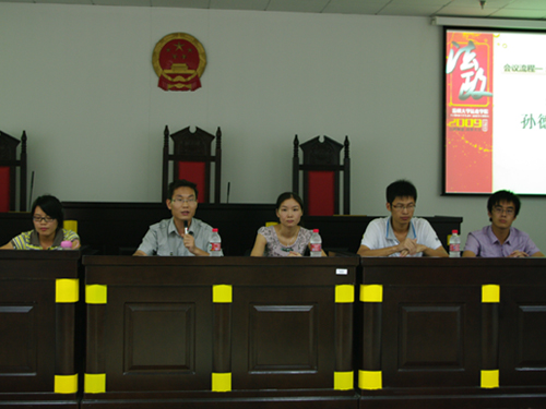 2009年9月10日晚,由法政学院团委学生会举办的新老生交流会在8号楼模拟法庭隆重举行。辅导员孙德升老师、孙慧老师,前学生会主席潘海斌,副主席王作洲,现任团委学生会全体成员与09级新生进行了一场面对面的深入交流。