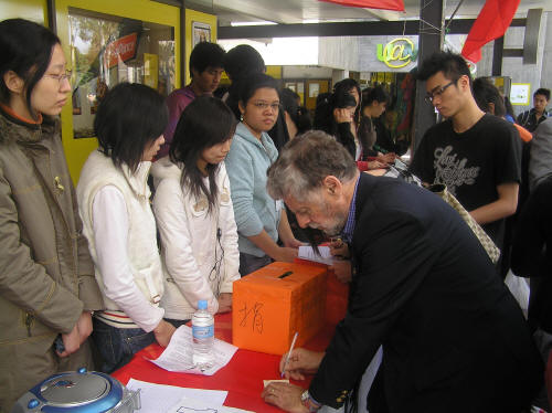 | 5月12日14时28分四川省汶川县发生的8级强烈地震之波及范围之大,30多年来的罕见,至今为止已造成5万多人遇难,近30万人受伤,累计失踪约3万余人。"爱心无国界,天虽无情,人间有爱"!自这场灾难发生之时起,灾区人民的救援及重建就牵动着每个人的心,包括海外的中国学子及国际友人,大家只有一个心愿,就是尽自己的力量,与灾区人民共渡难关、重建家园。 为此,在2008年5月19日-21日的全国哀悼日期间,在澳大利亚进修的法政学院钭晓东教授联合澳大利亚新南威尔士州中国学生学者联谊会Macquarie大学分会,在Macquarie大学组织"support China’s Sichuan"的爱心无国界抗震救灾捐款活动。海外学子的"心系祖国、心系灾区人民"的一片赤诚充分感染了Macquarie大学的中外师生,得到了Macquarie大学校方的全力支持。Macquarie大学副校长William McGaw代表校方充分表达了对"中华民族的凝聚力和自强不息精神"的敬佩与赞赏。除William McGaw副校长外,还有多名校方负责人士,如:世界自然保护同盟环境法委员会副主席、Macquarie大学环境法中心主任Michael Jeffery ,世界自然保护同盟环境法委员会委员、环境法中心副主任Donna Craig,国际事务主任Alison Taylor,社会学院Naren Chitty院长和语言学院经理Robyn Guilmette 等均现场支持义举并捐款。中国驻悉尼总领馆教育组白刚参赞和周波领事亲赴现场慰问师生,代表总领馆感谢中外师生们的义举,白刚参赞还将自己亲手书写的一幅书法作品"爱"送给组办方,作义卖筹款之用。三天里,广大中外师生纷纷解囊,共筹善款近33万RMB:其中澳币:47938.8元、人民币:6836.8元、美元:140.1元、港币:340元、以及少量加元、欧元、斯里兰卡元和汤加币。白刚参赞代表总领馆接受了这批善款。 此次Macquarie大学为中国四川灾区募捐及义卖活动得到了CCTV,the Australian New Express Daily and the Macquarie Globe,China Radio International,Macquarie University -Centre for Environmental Law Macquarie(//www.law.mq.edu.au/MUCEL/news/earthquake.htm)等的报导。爱心在跨国界层面得到了传递,同时也让世界共同见证了中华民族的凝聚力和自强不息的精神!