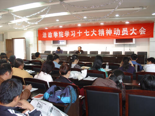 | 11月14日下午,法政学院在北校区行政楼331会议室召开了学习十七大精神动员大会。院党总支书记陈国治在会上传达了中央和各级党委关于十七大的文件精神,就如何学习、领悟和贯彻十七大精神进行布署,号召广大师生认真学习、领会文件的内容和精神,将十七大精神落到实处。陈国治书记还对前一阶段学院的学风建设工作进行了总结,对学风建设中突出的人和事予以表扬,同时也指出了不足之处,希望大家能克服困难,继续努力,将学院的学风建设进行到底,取得成效。会上,副院长姚周辉就学院当前正在进行的期中教学检查和下一阶段的迎评促建工作对老师们提出要求和建议,希望学院上下同仇敌忾,以高度的责任感和事业心,将十七大精神落实到学校的教学工作中。