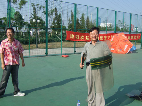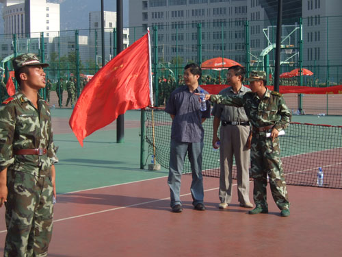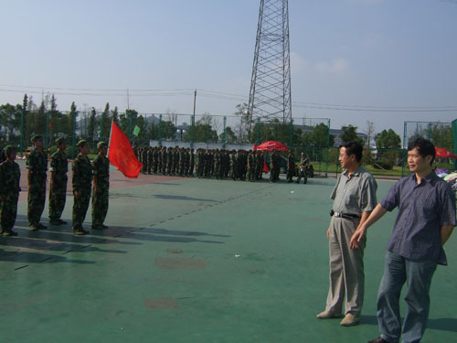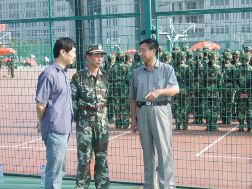 9月27日正是我校军训工作进行总结、提升和汇报表演预演、操练的关键时期。下午,烈日炎炎,同学们顶着烈日继续训练。法政学院蔡克骄院长、陈国治书记安排好手头的工作,在学生科科长杨振海和辅导员孙德升的陪同下专程赶到南校区运动场看望烈日下照常训练的法政新生和教官。 训练场上法政学院全体新生精神抖擞,加紧训练,虽然烈日下每个人都挥汗如雨,但仍是军容整肃,每个人的脸颊上明明都挂着刚毅的神情!看过同学们的操练和表演,蔡院长、陈书记不停的点头和鼓掌,对学院新生的精神状态和训练情况给与了热情的肯定和表扬,对教官们的辛劳表示感谢,同时也不忘叮嘱大家军训期间注意饮食卫生和身体休息。我院07法四班被选中作为学校军训汇报表演的警棍盾牌方队,蔡院长、陈书记还特意拿起军训道具"一试身手"并鼓励大家要全力以赴、力争上游!同学们对院领导的关心和鼓励报以热烈的掌声。 今年法政学院对新生军训工作高度重视,学院全面动员、统筹安排,不但按学校要求组建了新生军训工作领导小组,还专门安排了辅导员和新生班主任每天到训练场和寝室了解新生军训情况和身心状态,近期学院金南松副书记也几次赶到现场看望和鼓励新生。学院领导和老师的重视让法政新生的军训热情高涨,在学院"量力而训、注意安全,严格要求、勇夺佳绩"的军训动员口号下,今年法政新生军训实现了"健康、安全、零跟训",并基本达到了室外操练全勤。