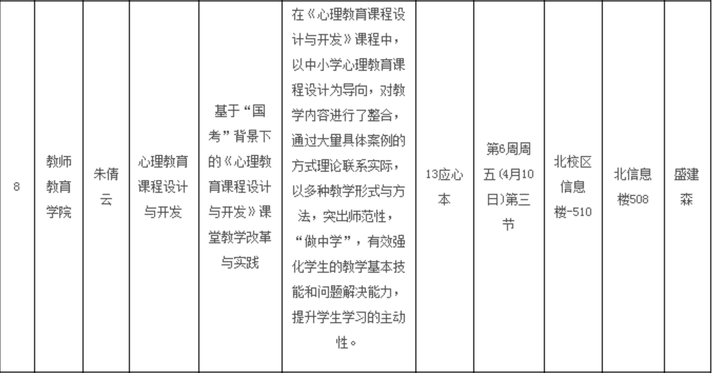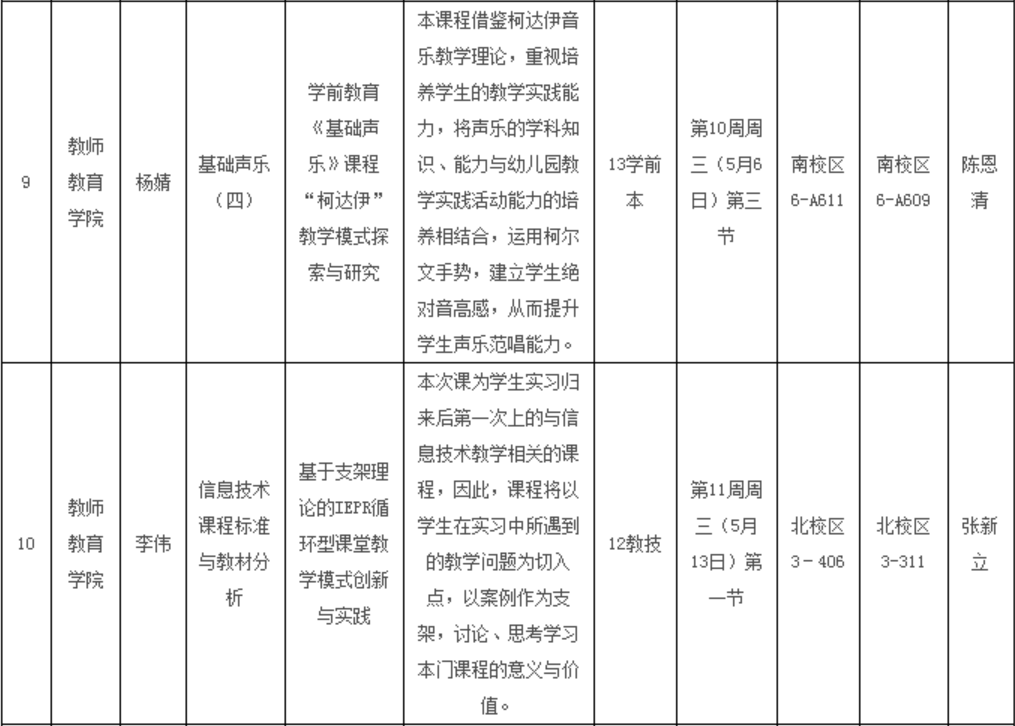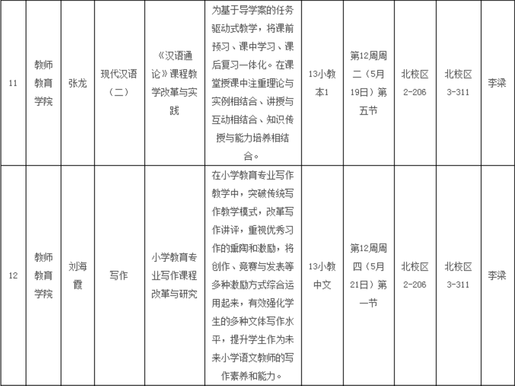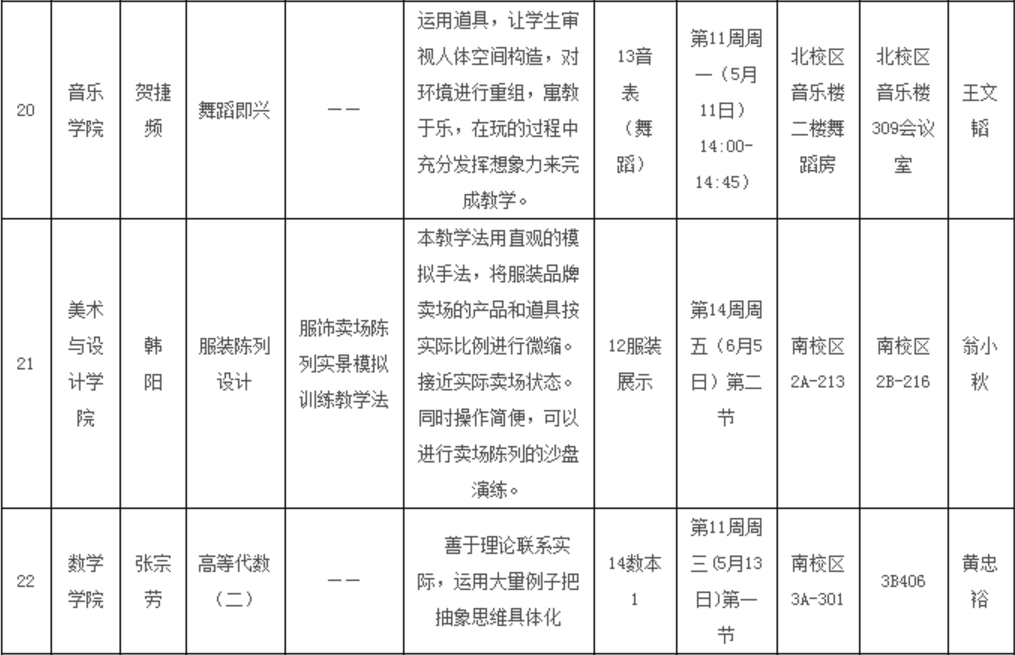 为增进各学院、各教师之间交流与学习,请各学院在做好示范课组织工作的同时,鼓励本学院教师积极参加其他学院的教改示范课观摩与研讨(各级教学名师、教坛新秀和教学技能获得奖必须参与观摩及评课活动)。教务处也将适时会同教师教学发展中心参与示范课活动。