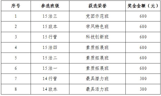 我院于2016年11月14日开展了法政学院第九届特色班级评选,现将获选班级和班级建设奖金公布如下: