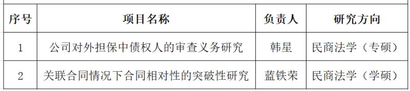 根据《九色视频 优秀研究生学位论文培育项目实施方案》的规定,由学生自愿申请并提交相关材料,经学院学术委员会评定,以下《公司对外担保中债权人的审查义务研究》等2个项目评定为院级学位论文培育项目,现将评审结果予以公示: